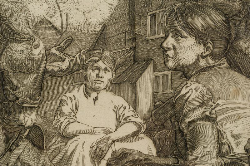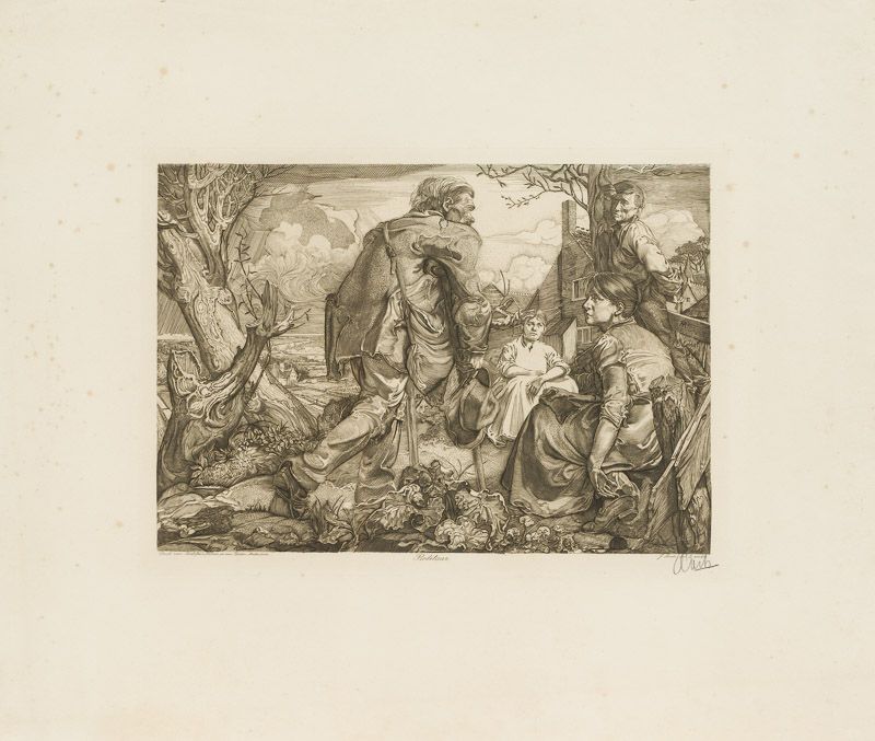 Rare, antique, vintage, original Lithograph by the dutch artist Johannes Josephus Aarts, showing the scene of an invalid beggar entering a Hamlet of farmers and asking for alms. Striking and beautiful scene in the typical earthy, nature-embedded, strong depiction by Aarts; full of character and gripping through the magnified presence of Aarts subjects, which are “in your face”. Signed in pencil by Johannes Josephus Aarts. [Fine Art-Paper watermarked “TRCHES”]. [Amsterdam], Roeloffzen, Hübner und van Santen, 1903. Size of the framed Picture: 63 cm wide x 53 cm high. Size of the Sheet : 49 cm wide x 41 cm high (the image itself: 22 cm x 30 cm). Excellent condition, beautifully framed. The price for this signed and rare lithograph includes free international courier shipping per UPS Express.