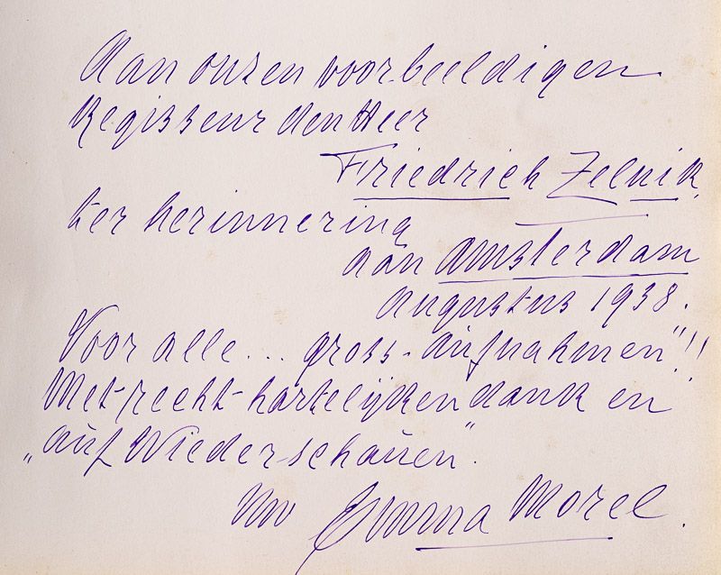 Zesde Vermeerdere Druk. Amsterdam, Scheltema & Holkema, (ca.1925). 4°. VIII, 372 pages with 613 photographs of Old Amsterdam, prior to the second world war. Original illustrated Hardcover. Very good condition with only minor signs of external wear. Hinge slightly shaky. From the library of Frederic Zelnik / Friedrich Zelnik. Inscribed to Frederic Zelnik by one of his silent cinema actresses, Emma Morel, during the filing of “Vadertje Langbeen”, based on a Novel from Jean Webster and adapted fror the screen by Rudolph Bernauer, the film was made by Zelnik and filmed in Amsterdam. Emma Mourel was one of the stars of the Movie and inscribed the book to Zelnik: “Van ouren voorbeeldigen Regisseur den Heer Friedrich Zelnik, her herinnering van Amsterdam Augustus 1938. Voor alle….Gross-aufnahmen !! Met reeht-hartelycken dank en auf Wiedersehen von Emma Morel”.