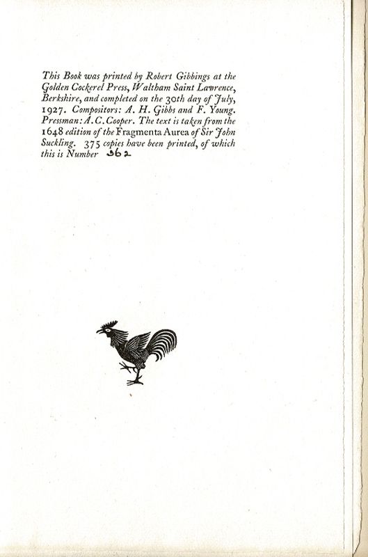 This Book was printed by Robert Gibbings at the Golden Cockerel Press, Waltham Saint Lawrence, Berkshire, and completed on the 30th day of July, 1927.