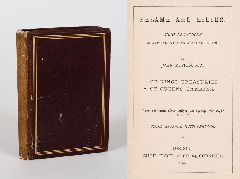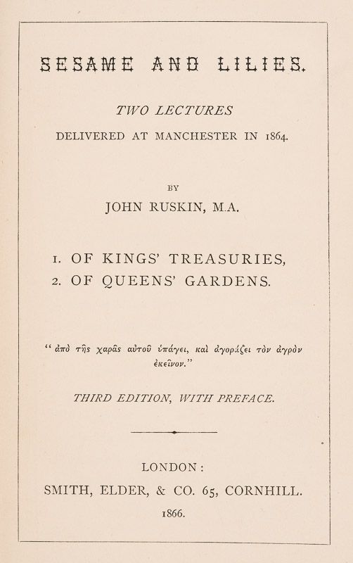 Sesame and Lilies: Two Lectures delivered at Manchester in 1864: Of Kings’ Treasuries and Of Queens’ Gardens.